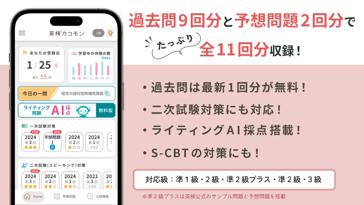 「カコモン」では、過去の英検問題9回分に加え、特別に用意した予想問題が2回追加され、合計で11回分の問題を解くことができます。準1級から3級まで対応しており、旺文社編集部による詳細な解説が全ての問題に付属しています。これにより、解答や訳、英文スクリプトをワンタップで確認できる利便性が高まっています。