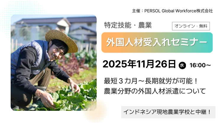 2025年11月26日(水)、パーソルグループ傘下のPERSOL Global Workforce株式会社による「特定技能・農業分野における外国人材受入れセミナー」が開催されます。このセミナーは、労働力不足に直面している農業事業者や関係者を対象にしたものであり、参加は無料です。