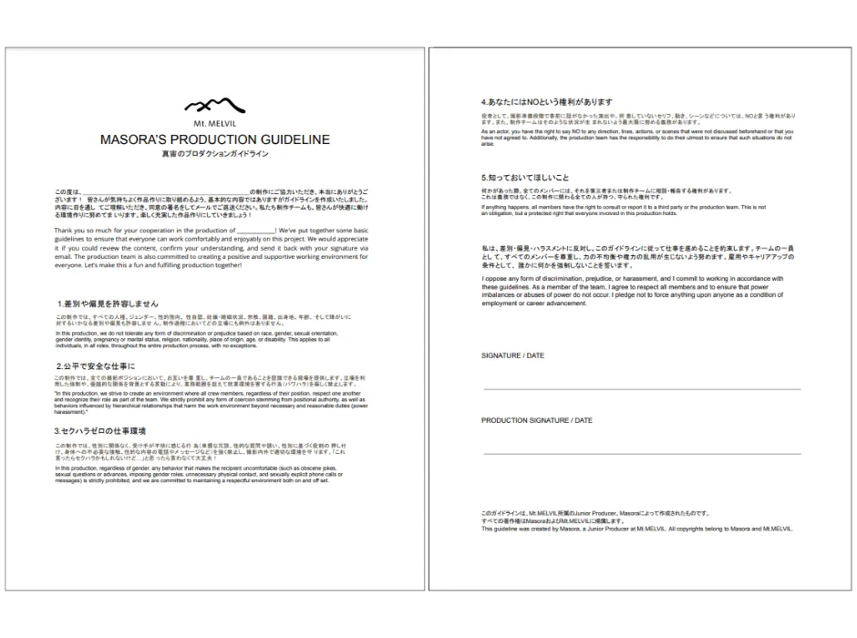 このガイドラインは、Junior Producerの福田真宙が中心となって作成し、映画や映像制作の現場で信頼される環境を整えるための明確な指針を提供している。基本的な原則には、「差別や偏見を許容しない」「公平で安全な職場環境の確保」「セクシャルハラスメントの禁止」「個々の権利の尊重」といった内容が盛り込まれ、制作現場におけるチャレンジやリスクを軽減することを目指している。