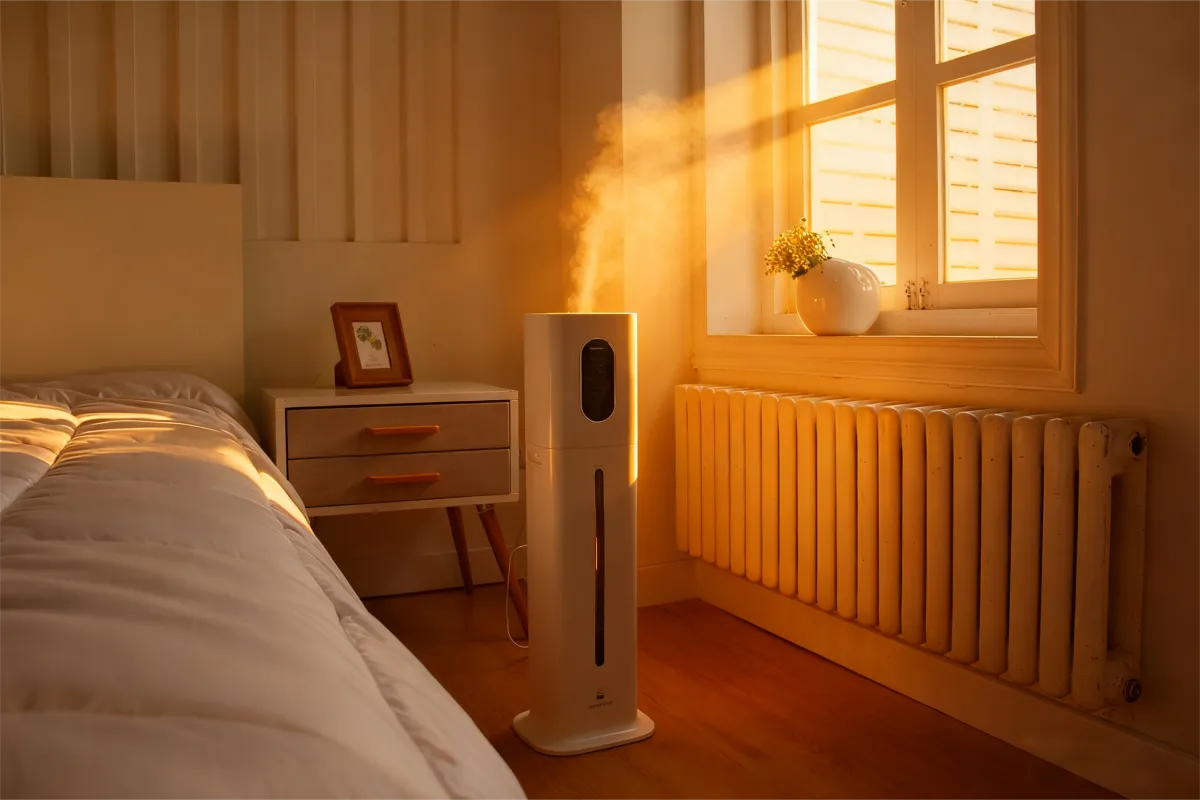 さらに、この加湿器はスマート自動運転機能を搭載しています。設定したい湿度(40~90%)を選び、その湿度に達したら自動で加湿を停止します。湿度が下がると再び加湿が始まるため、過剰な加湿を避け、快適な室内環境を維持します。この機能により、湿度が高すぎて床が濡れる心配もありません。