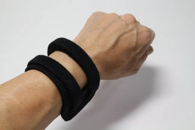 この手首サポーターは、幅1cmのストラップが2本だけで手首をしっかりと固定します。圧迫強度は調整可能で、必要以上の締め付けを避けることができます。