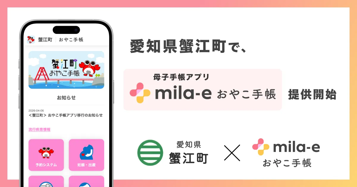 愛知県の蟹江町が、株式会社ミラボの開発した母子手帳アプリ「mila-e おやこ手帳」を2026年4月6日より導入することが発表されました。このアプリは「蟹江町おやこ手帳」として、地域の子育て家庭を支援するために提供されます。