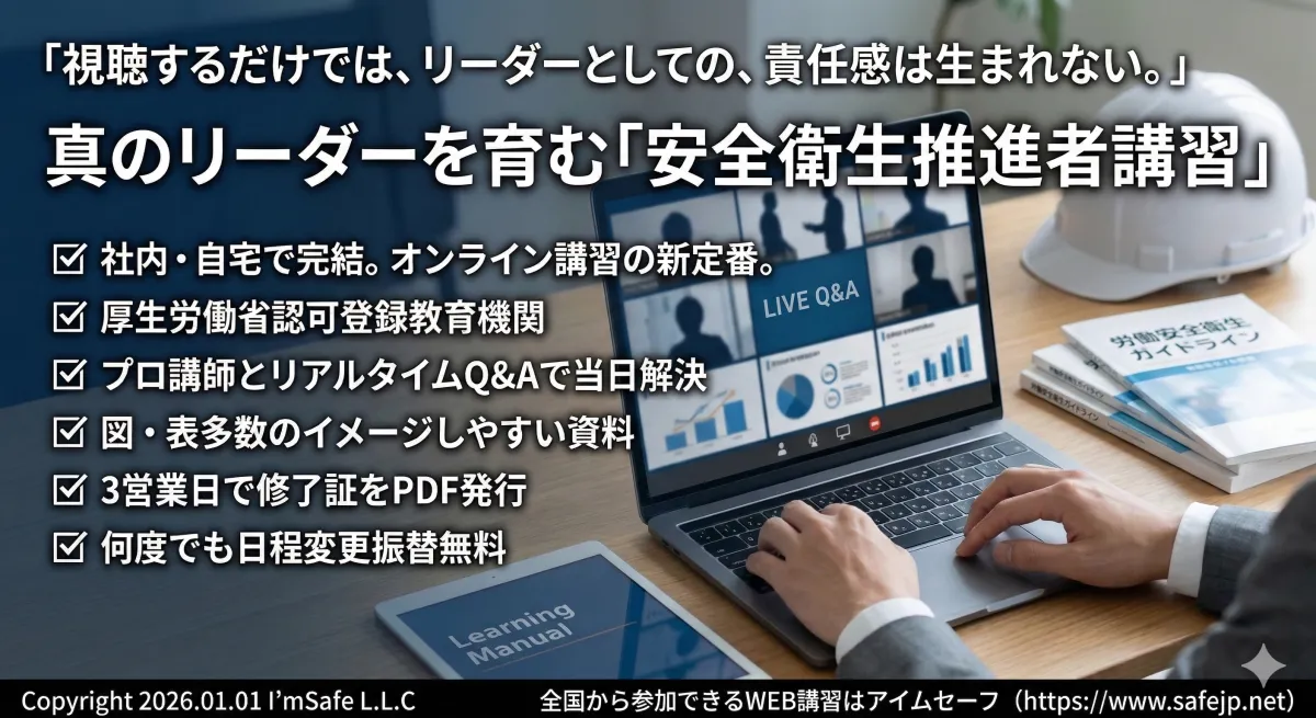 2026年5月、アイムセーフ合同会社が主催するオンライン講習が全国で受けられるチャンスが訪れます。厚生労働省の認定を受けたこの講習は、企業における労働安全のリーダーを育成するための重要なカリキュラムです。リモート参加型のこのプログラムは、特に大企業や中小企業に多く利用されており、業種を問わず多様な事業所が参加されています。