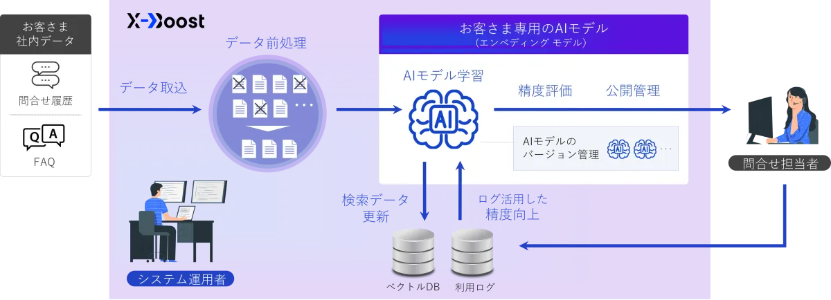 「X-Boost」の最大の魅力の一つは、直感的なUI/UXです。エンジニアでなくとも、現場の担当者が容易に操作できるため、短期間での導入を実現します。また、データは日本国内のサーバーで安全に管理されるため、情報漏洩のリスクも最小限に抑えられています。さらに、導入後のデータ蓄積により、自社向けにカスタマイズされた高精度なAIモデルを育成できるため、将来的なニーズに対応したサービス提供が可能になります。