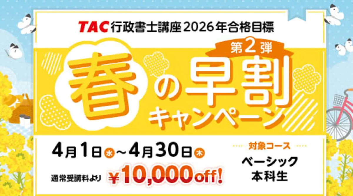 行政書士試験対策を行っているTAC株式会社が、2026年の合格を目指すための『ベーシック本科生』コースを全国のTAC校舎で4月から開講します。また、今春は初学者向けに特別な割引キャンペーン『春の早割キャンペーン第2弾』が4月1日から30日まで実施されるので、この機会にぜひ学び始めてみてはいかがでしょうか。