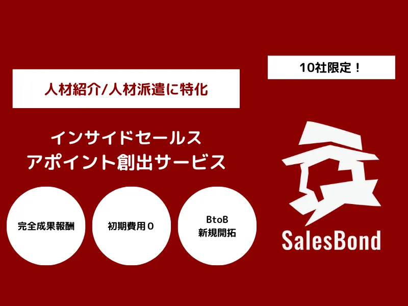 「HUMANBOND」は人材紹介および人材派遣サービスに特化した完全成果報酬型のインサイドセールス代行サービスです。東京・新宿に本社を構えるセールスボンド株式会社が提供し、企業の新規開拓を総合的に支援することを目的としています。