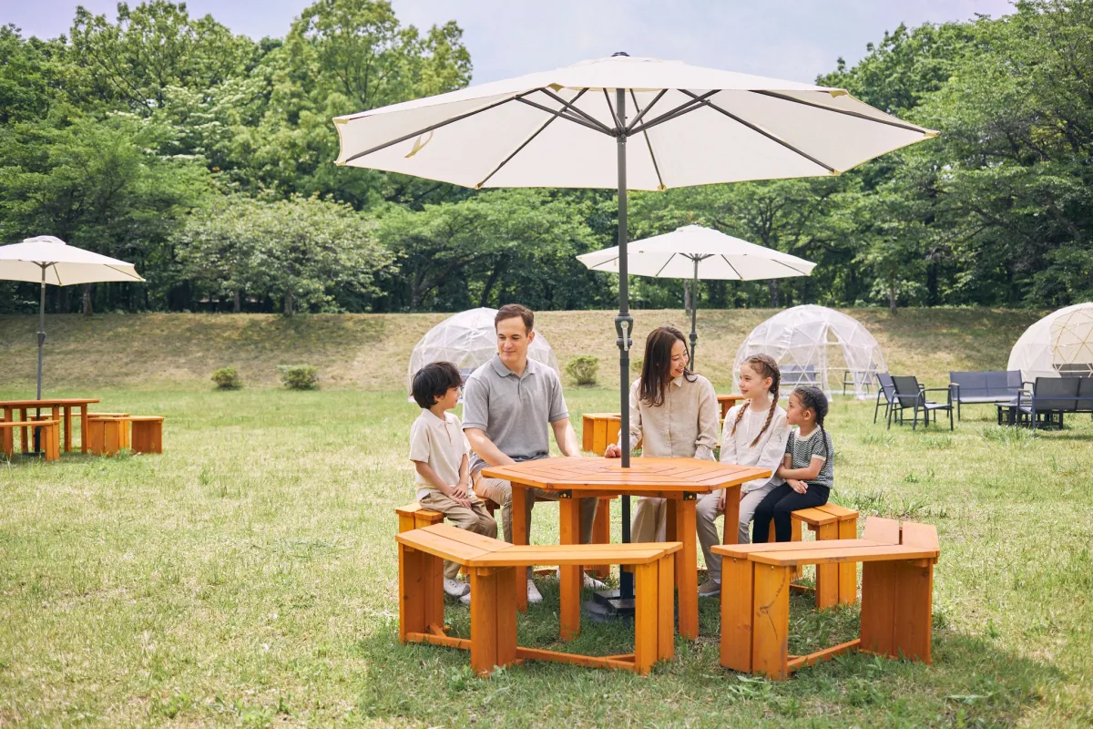 ピクニックエリアは、リラックスできる雰囲気が漂い、家族全員が心地よく過ごせる場所です。パラソル付きのガーデンテーブルが設置されており、自然の風を感じながら食事を楽しむことができます。自身で持ち込んだフードやドリンクを自由に味わいつつ、ピクニックシートの貸し出しも行っているため、気軽に持ち運べます。