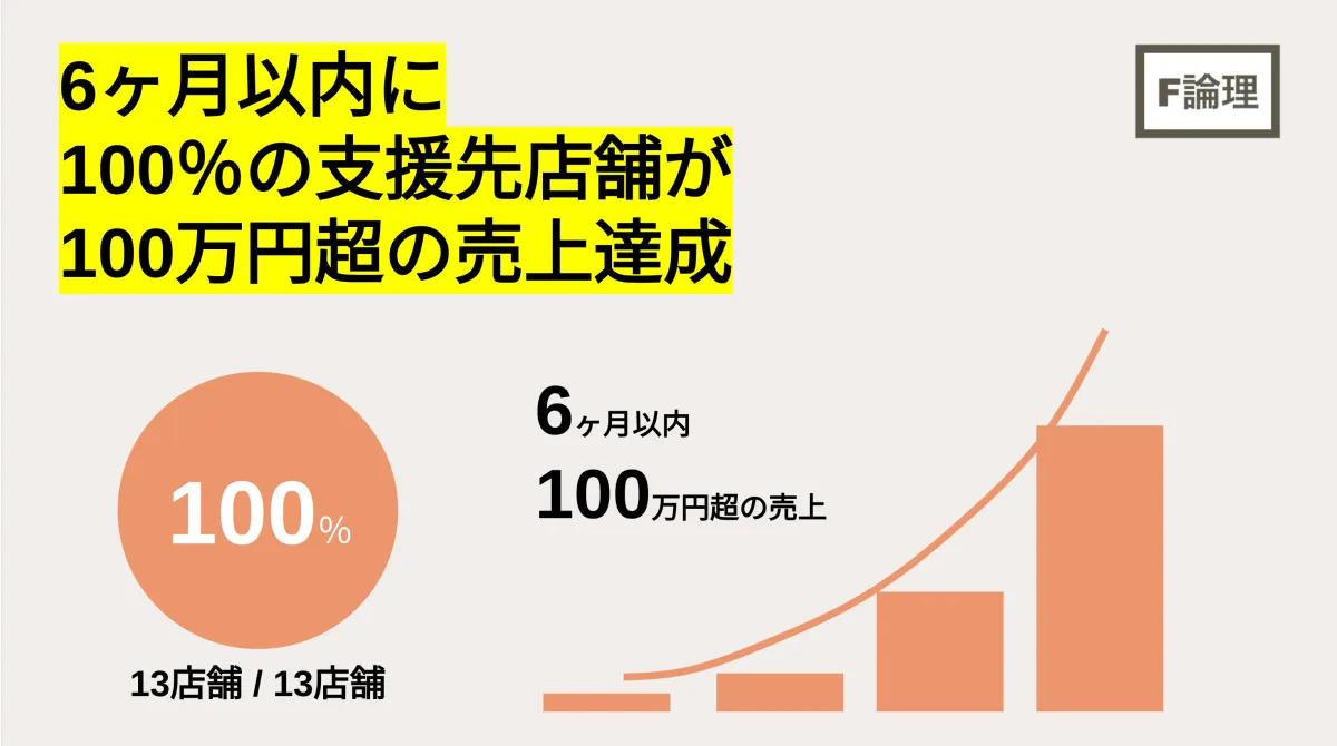 フリーロンリでは、支援を受ける店舗が実に全体の100%にあたる店舗が、6ヶ月の支援期間中に月商100万円を超える成績を収めました。その実績は特筆すべきものであり、成功の要因はさまざまです。ここではいくつかの具体例を挙げてみましょう。