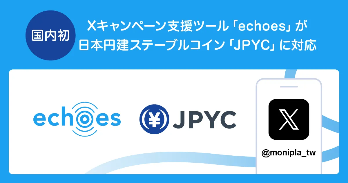 株式会社アライドアーキテクツ(東京都渋谷区)は、Xキャンペーン支援ツール「echoes」において、日本円建ステーブルコイン「JPYC」との連携を開始したと発表しました。本提携により、企業はキャンペーンのインセンティブとしてJPYCを活用することが可能になります。