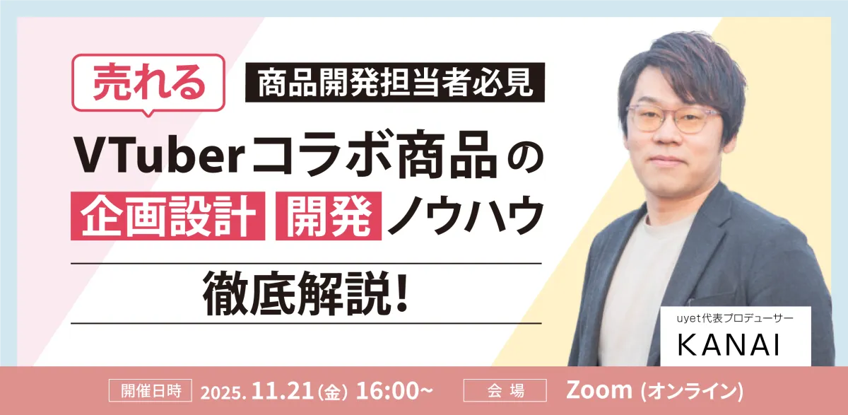 株式会社uyetは、2025年11月27日(木)19時から、VTuberを活用した商品開発を検討している企業向けにオンラインウェビナーを開催します。「売れるVTuberコラボ商品の企画設計・開発ノウハウを徹底解説!」と題したこのセミナーでは、VTuber市場の急成長に伴い、コラボ商品開発の成功と失敗の要因を探ります。