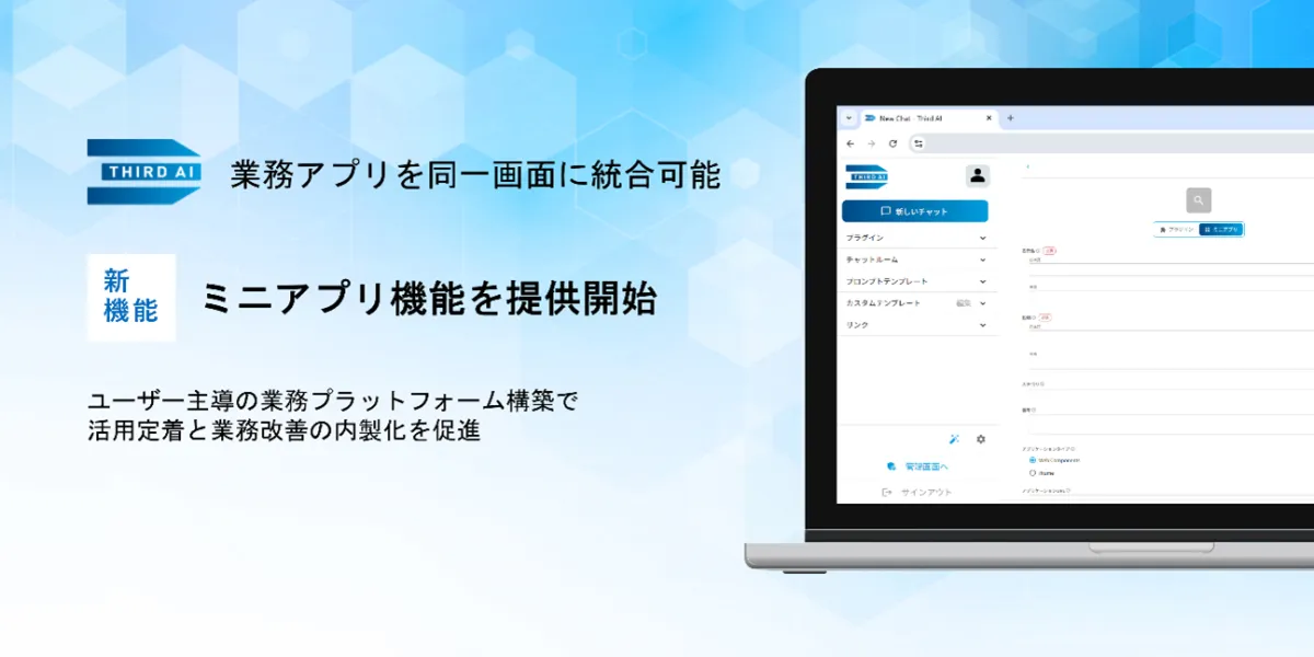 東京に本社を置くJTP株式会社は、AIインテグレーションサービス「Third AI」において、生成AIのビジネス活用をサポートする新機能を追加しました。2026年3月10日より、業務Webアプリケーションを一つの画面上で操作可能にする「ミニアプリ機能」が提供されることで、ユーザーは日常業務に必要な様々なアプリを、よりシームレスに利用することができるようになります。