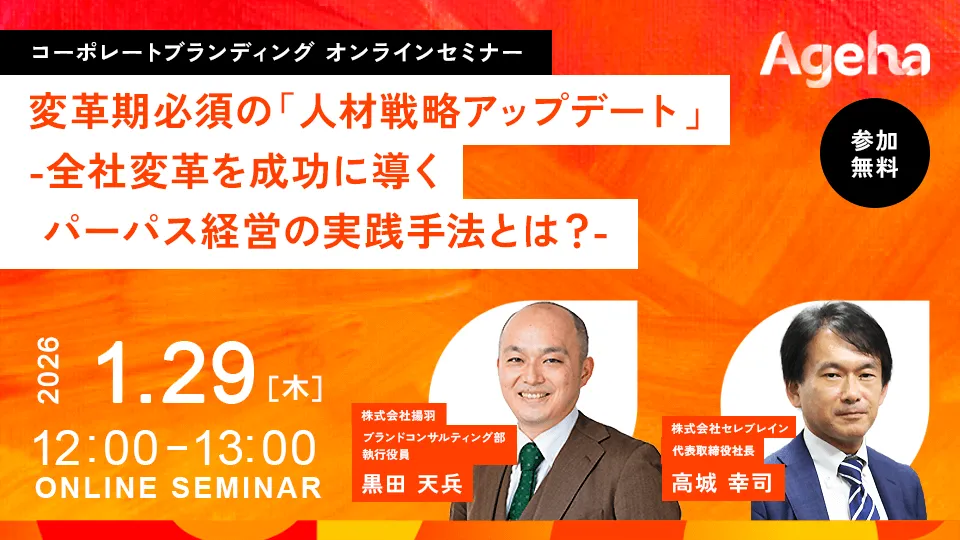 株式会社揚羽の主催によるオンラインセミナーが、2026年1月29日(木)に開催されます。テーマは「変革期必須の『人材戦略アップデート』-全社変革を成功に導くパーパス経営の実践手法とは?」です。このセミナーは、企業が直面する変革期においてどのように『人材戦略』を効果的に更新できるかを探る内容となっています。