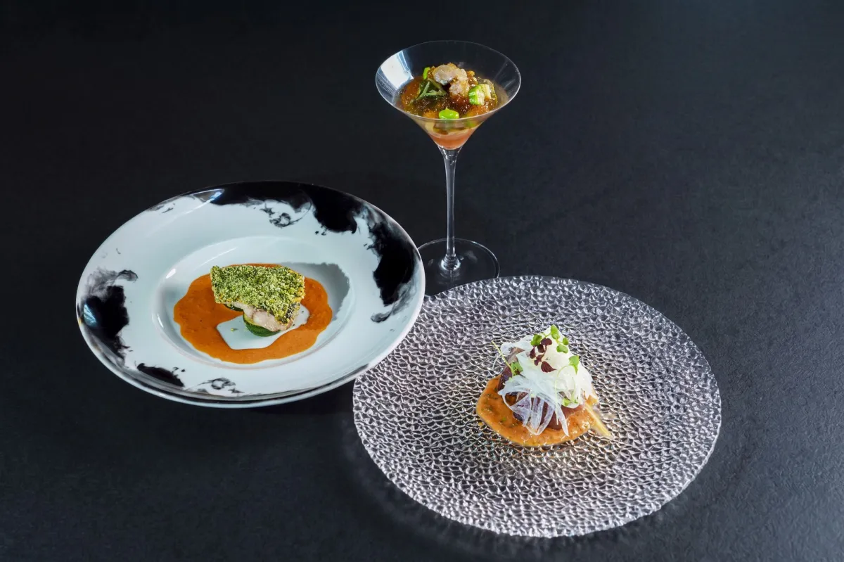 特に注目したいのが「鱧の炙りとじゅんさい 初夏野菜コンソメジュレ」です。この一品は、香ばしく炙った鱧の旨味と、みずみずしいじゅんさい、旬の野菜をまとめた爽やかなコンソメジュレで仕上げられています。香ばしさとさっぱりとした味わいは、初夏の訪れを感じさせてくれます。