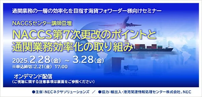 NECネクサソリューションズが主催する「NACCS第7次更改のポイントと通関業務効率化の取り組み」セミナーが2025年2月28日から3月28日までオンデマンド配信されます。このセミナーは、海貨フォワーダーの皆様を対象に通関業務の効率化を図るための内容が盛り込まれています。申し込みの締切は2025年2月21日。参加費は無料です。