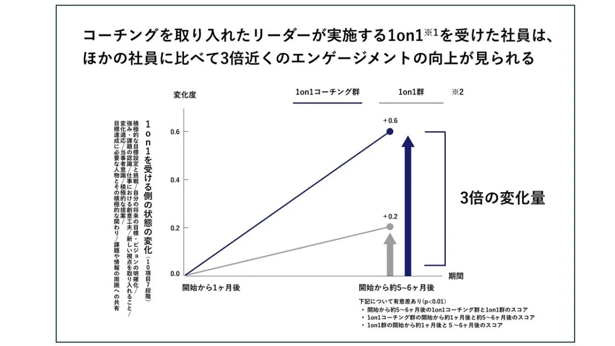 これに対しコーチ・エィは、コーチングの手法を取り入れたコミュニケーションの重要性を提唱しています。彼らの研究機関である「コーチング研究所」でも、コーチングを用いた1on1が部下のエンゲージメント向上につながる事例が確認されています。