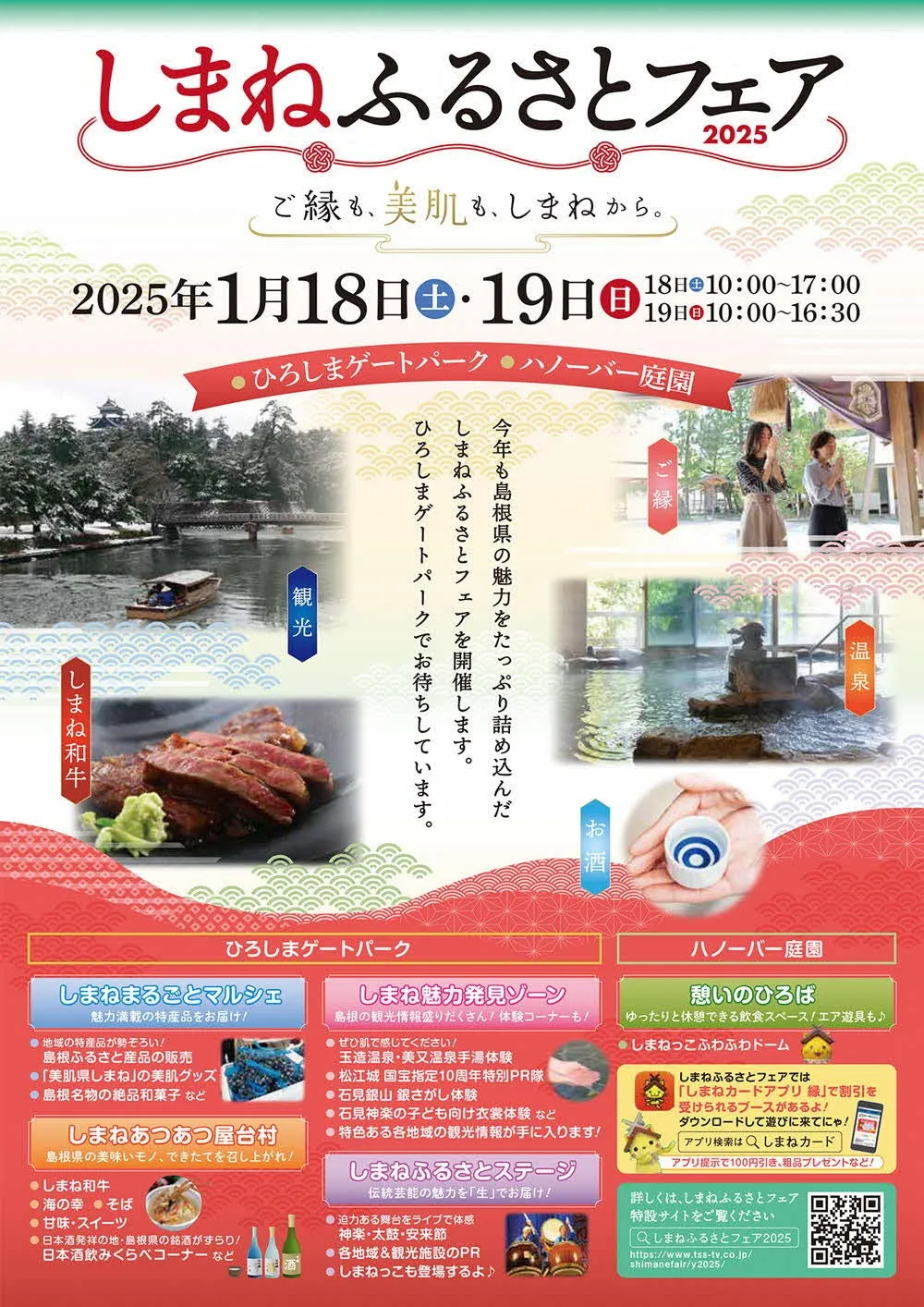 島根県とその周辺市町が共同で、広島県内の交流人口を増やすことを目的にしたイベント「しまねふるさとフェア2025」が開催されます。このイベントは、広島のひろしまゲートパークプラザおよびハノーバー庭園にて、2025年1月18日(土)と19日(日)の二日間に渡って行われます。