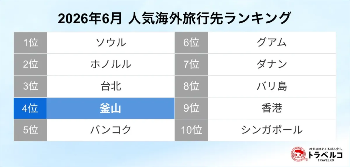 株式会社オープンドアが運営する旅行比較サイト「トラベルコ」では、2026年6月の人気海外旅行先ランキングが発表されました。この結果によると、韓国の釜山が前年比で約1.7倍の検索数を記録し、前年の7位から4位へと急上昇しました。近距離アジア圏の利便性が影響しているとされ、多くの旅行者が注目しています。