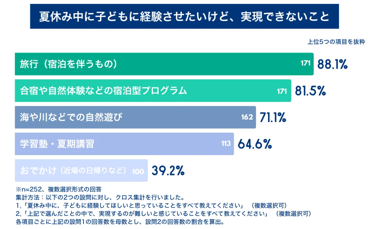 調査によると、保護者が考える夏休みの価値は、「学校ではできない体験」「思い出づくり」「心身のリフレッシュ」が重要視されています。しかし、実際に「経験させたい」と考える「旅行」や「合宿」「自然体験」については、約80%の保護者が「実現できない」と感じています。特に、「金銭的余裕がない」ことが主な理由として挙げられました。