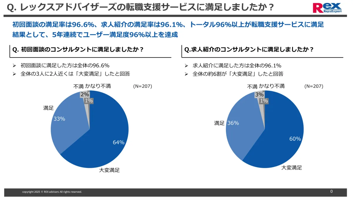 株式会社レックスアドバイザーズが実施した利用者満足度に関する調査で、同社の転職支援サービスは5年連続で満足度96%を超えるという素晴らしい成果を上げました。この結果は、207名のユーザーからのアンケートに基づいており、初回面談や求人紹介に対して高い評価を受けています。