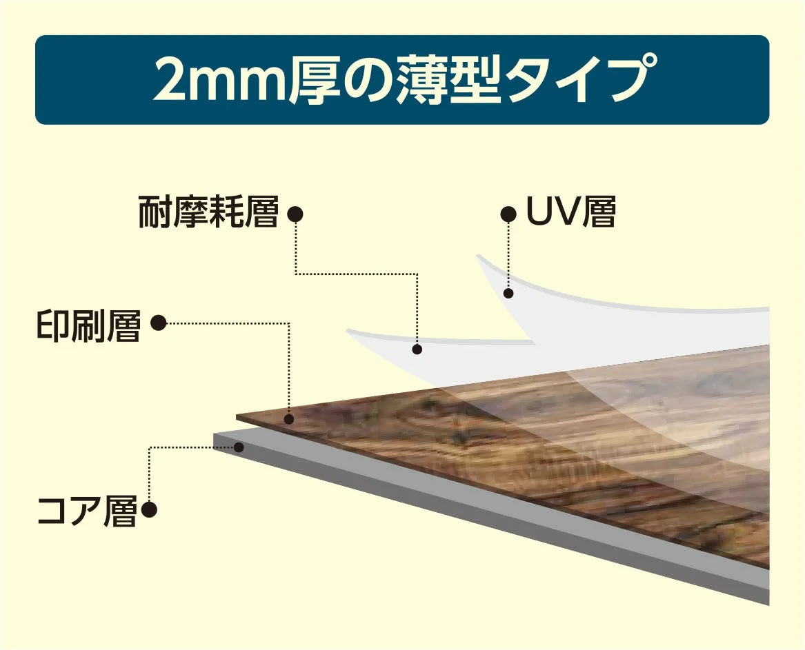 このパネルは厚さ約2mmの薄型設計で、非常に軽量です。そのため、施工や運搬時の負担も少なく、一般家庭でも気軽に扱うことが可能です。施工方法も柔軟で、接着剤、釘打ち、強粘着両面テープなど、様々な手法から選択できます。もちろん、必要に応じてカッターナイフで簡単にカットも可能です。
