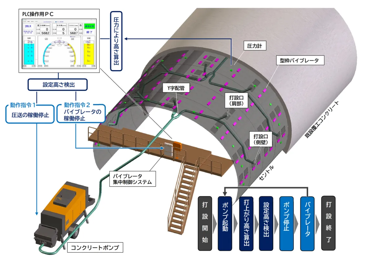 自動打設システムは、従来の手作業に依存する打設作業を大幅に改善する目的で開発されました。このシステムは、「高速打設システム」と「圧力計による打設高さ検知システム」を組み合わせており、これにより期待されるのは、作業の自動化と労力の削減です。具体的には、予め設定した高さに応じてポンプの圧送速度やバイブレータの稼働が自動的に制御されるため、職人の腕前に左右されることなく安定した品質が保証されます。