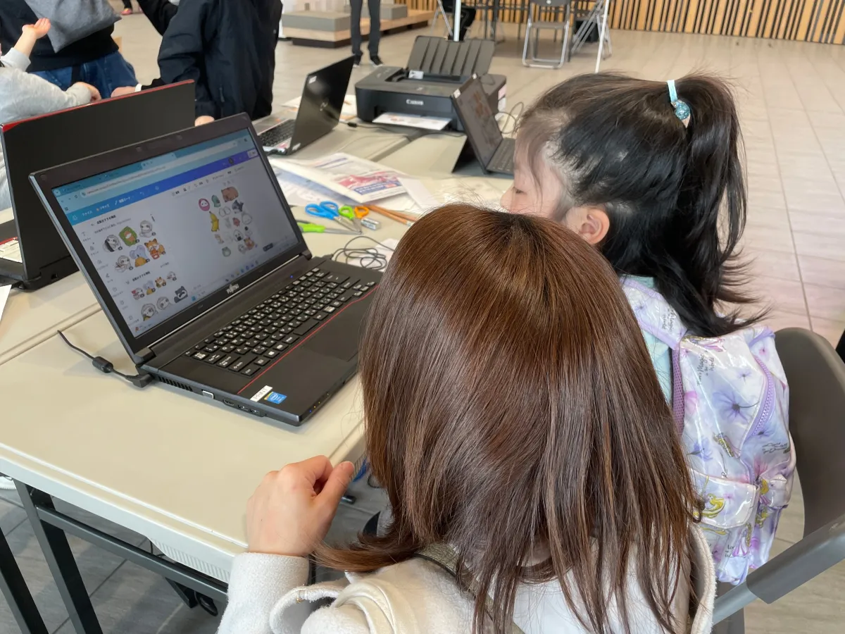 パーソナルコンピューターを使って、オリジナルのシールを作る体験が行われました。初めての操作に戸惑う子どもたちも、スタッフの説明を受けながら次第にデザインが形になっていく様子が見られました。最終的に完成した際、子どもたちの顔には自然と笑顔が溢れていました。自分で作成したものを手にするその瞬間、彼らの心に残る達成感があったことでしょう。