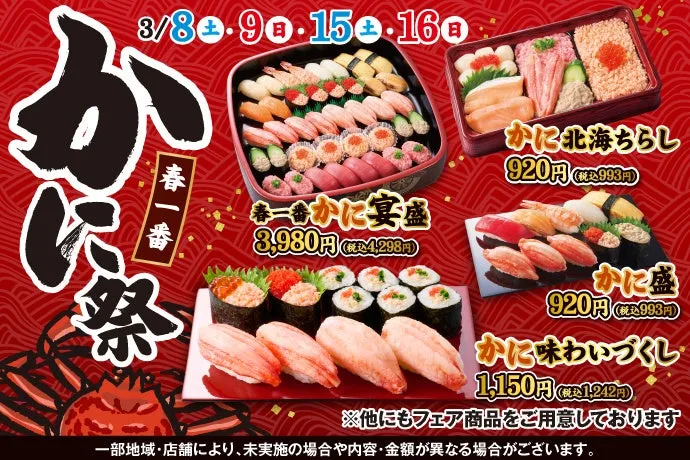 2025年3月8日から開催される小僧寿しの『春一番かに祭』は、春の訪れを告げる特別なフェアです。このイベントでは、人気のある『本ずわいがに』と、甘くて弾力のある珍味『まるずわいがに』を使用した様々な寿司メニューが楽しめます。フェアは、2025年の3月8日(土)、9日(日)、15日(土)、16日(日)の2週にわたって実施されます。