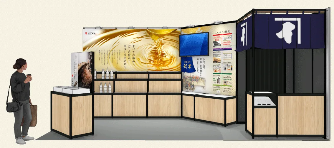 にんべんは320年以上の伝統を持つ鰹節専門店であり、その歴史には日本の食文化とも深い関わりがあります。出展ブースは、木目調のデザインで江戸の商店をイメージした空間で構成され、来場者はだしの本質的な価値を体感できるよう工夫されています。特に、鰹節の製造工程やその味わいを紹介する映像は、訪れた人々にだしの奥深さを理解してもらう重要な要素です。また、にんべんの「ストーリー」や歴史的背景を伝えるPOPも掲示し、だしの文化を知るきっかけを提供します。