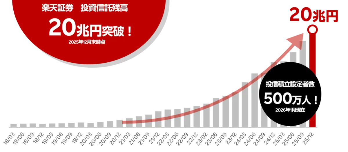 楽天証券株式会社は、2025年の5月に投資信託残高が10兆円を超えて以降、2026年の年明けに何と20兆円に達することを発表しました。この驚異的な成長は、わずか1年7カ月で実現したもので、国内の投資信託市場における新たなマイルストーンとなりました。さらに、投資信託の積立設定者が500万人を突破したということも大きなニュースです。