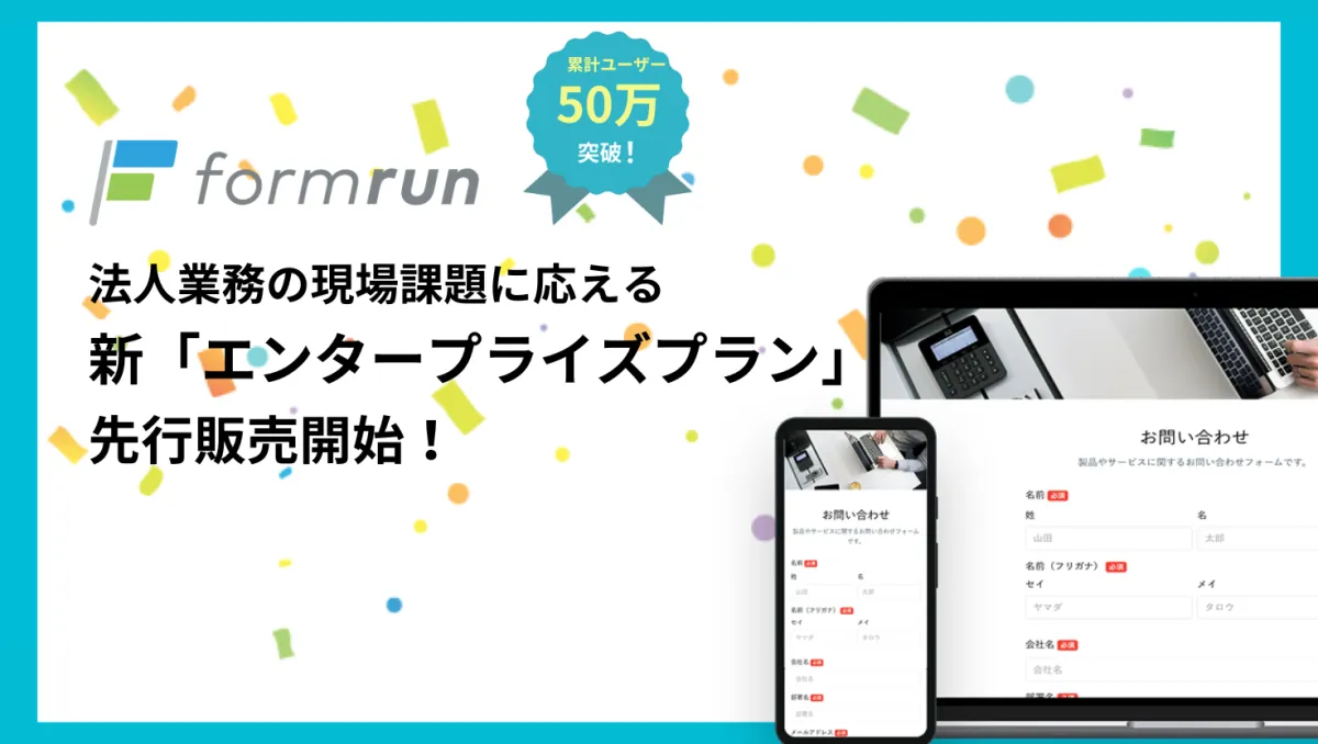 株式会社ベーシックが提供するフォーム作成・管理ツール『formrun』は、2025年8月時点での累計ユーザー数が50万人を超えたことを記念し、新たに法人向けの「エンタープライズプラン」の先行販売を開始しました。これにより、法人業務の現場が抱える課題に対する解決策をさらに強化し、様々なニーズに応える準備が整いました。