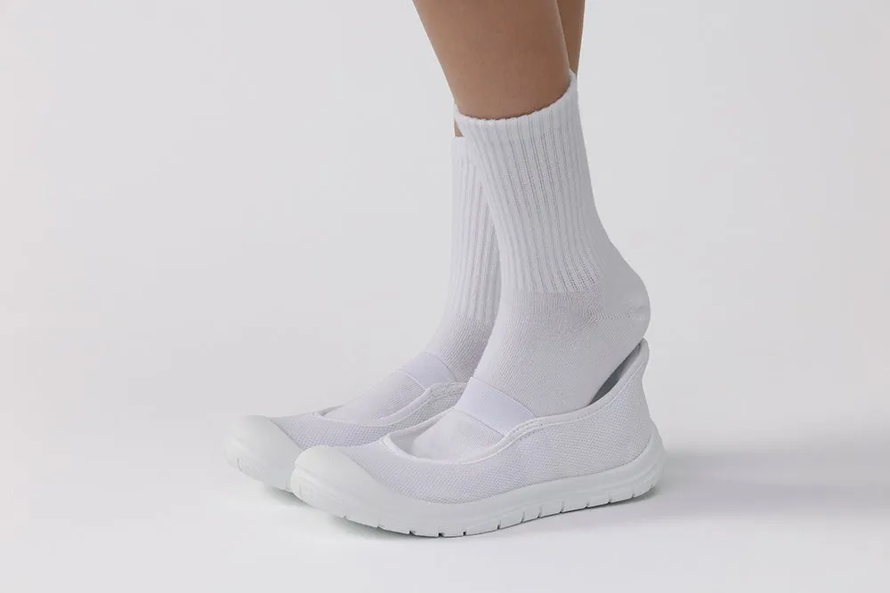新商品である上履きスパットシューズ、型番BF-005とBF-006は、特許を取得した靴ベラ状のかかと構造を持っています。これにより、かかとを踏むことなく立ったまま履くことができ、短時間での脱ぎ履きが可能です。特に、学校の登下校時や運動場での活動時には、着脱が頻繁に行われるため、履きやすさは非常に重要です。
