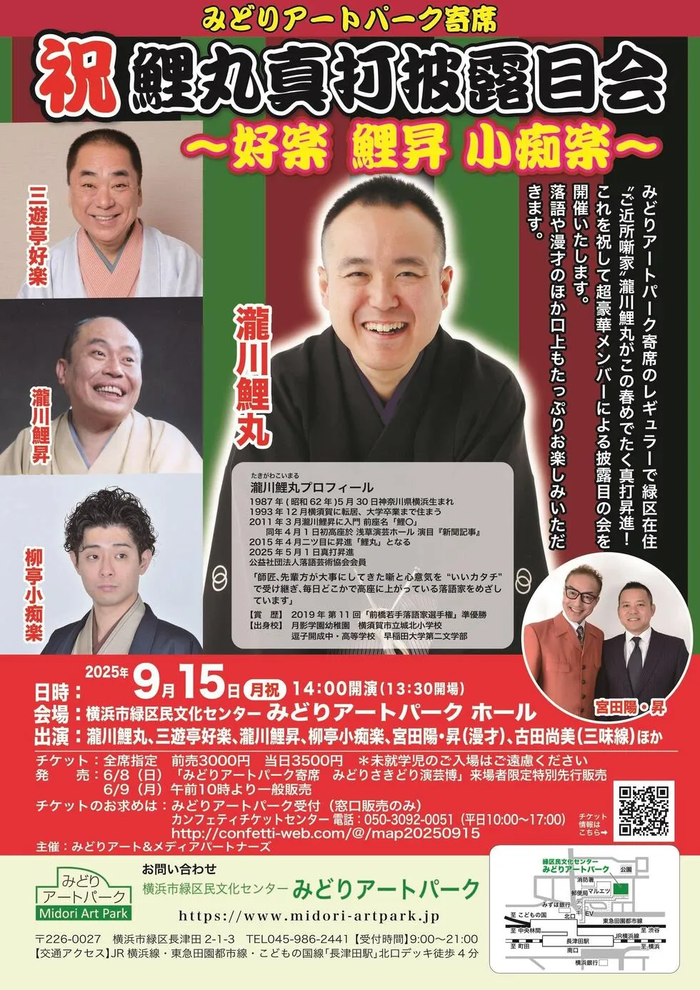 横浜市の緑区に位置する「みどりアートパーク寄席」にて、地元で活躍する落語家、瀧川鯉丸の真打昇進を祝う特別な披露会が開催されます。このイベントは2025年9月15日(月・祝)に行われ、地域の文化を支える「みどりアート&メディアパートナーズ」が主催します。
