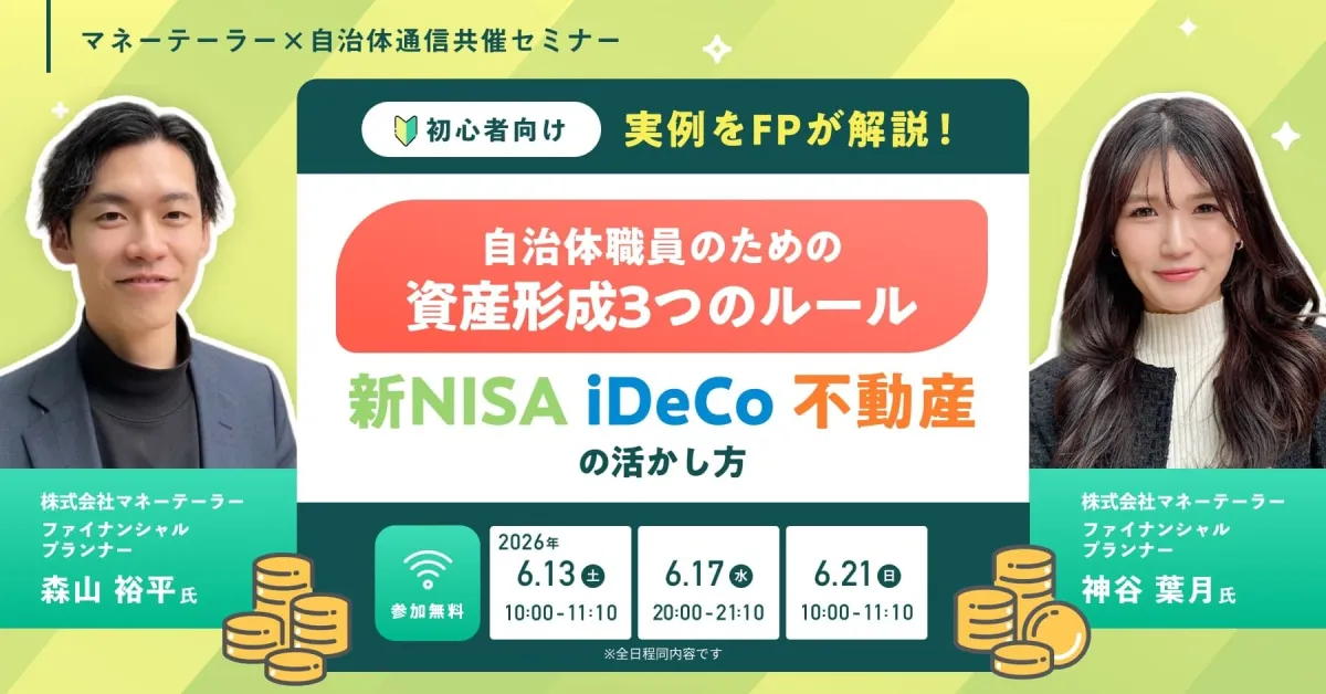 イシン株式会社が運営するメディア『自治体通信』による、マネーテーラー主催の資産形成セミナーが開催されます。このセミナーでは、「初心者向け【実例をFPが解説!】自治体職員のための資産形成3つのルール」というテーマで、具体的な事例を交えながら資産運用について学べる貴重な機会です。