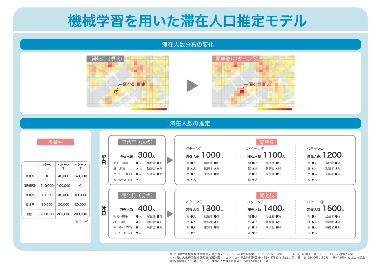 滞在人口を算出する際には、対象エリアにおける複数の開発案の建物用途や床面積をシステムに入力することで、開発前後の変化をシミュレートします。このモデルは、平日と休日それぞれにおける滞在人口の推定を可能にし、朝、昼、夕、夜の時間帯別の人口数や、居住者、勤務者、来街者の割合も確認することができます。これにより、開発方針に応じた最適な計画の策定が容易になります。
