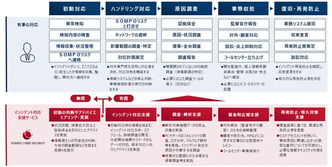 具体的には、初動対応を支援するだけでなく、事故の状況に応じてフォレンジック調査やコールセンターの立ち上げなどを行います。これらの追加的なサービスは有償ですが、JNX団体サイバー保険制度に加入することによって、多くの費用が保険金として支払われるため、企業の負担を軽減できます。