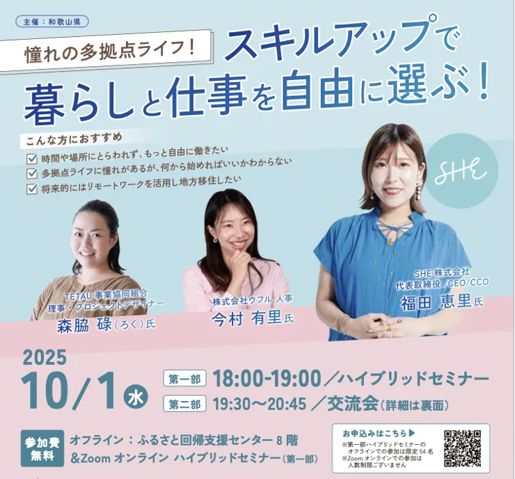 和歌山県は、働き方やライフスタイルが変化する現代において、自由なキャリアや多拠点生活に興味を持つ方々に向けて、トークイベント『スキルアップで暮らしと仕事を自由に選ぶ!』を2025年10月1日(水)に開催します。本イベントは、新しい働き方を体験するトップランナーが参加し、参加者に向けた情報を提供します。