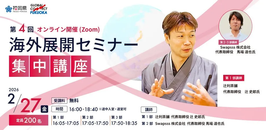 北九州市の老舗茶舗「辻利茶舗」が、海外市場での展開を拡大するためのセミナーを2月27日(金)に開催します。このセミナーでは、同店の代表取締役である辻史郎氏が登壇し、抹茶ビジネスにおける成功・失敗のリアルな体験を語ります。さらには、欧州ビジネスに詳しいSwapsss株式会社の馬場達也氏も登壇し、海外展開に必要な知識を伝授します。