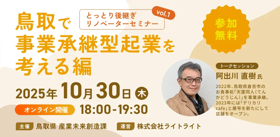 2025年10月30日(水)、鳥取県にて「とっとり後継ぎリノベーターセミナー vol.1」が開催されます。このセミナーは、オープンネーム事業承継「relay(リレイ)」を運営する株式会社ライトライトが主催し、鳥取県と連携して進める事業承継型起業をテーマにしています。参加は無料で、オンライン形式で行われるため、どなたでも気軽に参加できます。