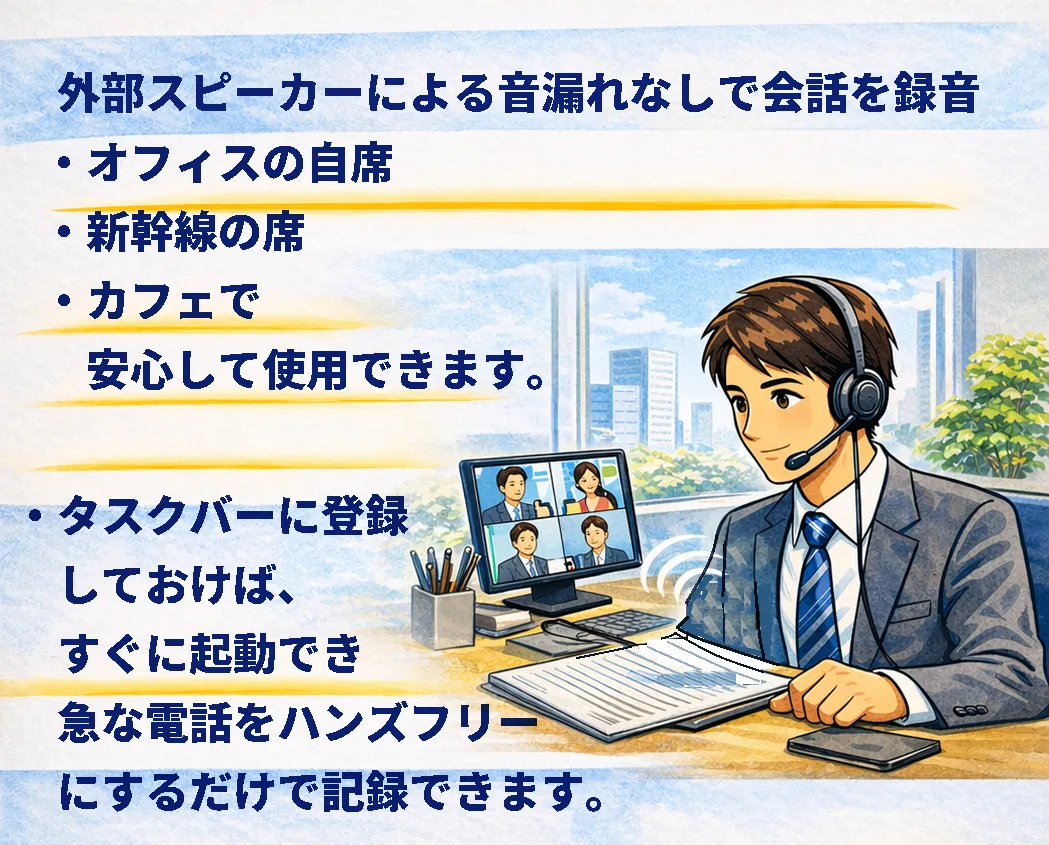 タスクバーから即座に起動でき、急な電話の際でもハンズフリーで録音を開始することができます。これにより、ICレコーダーを探す手間が省け、スムーズな作業が実現します。