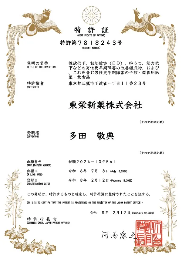男性更年期障害に特化した新たなサプリメント特許取得!