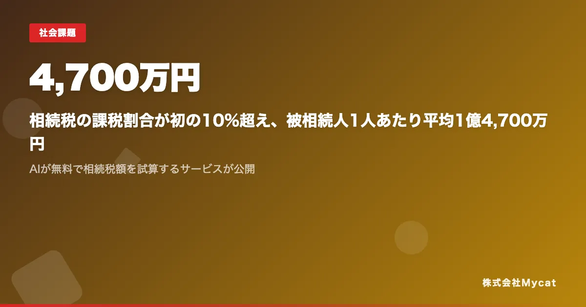 このような中にあって、株式会社Mycatが提供する新サービス「相続AI」が注目を集めています。このサービスでは、相続財産の種類や概算額、法定相続人の人数、そして適用可能な特例の自動判定などを入力することで、AIが相続税額の目安を算出します。