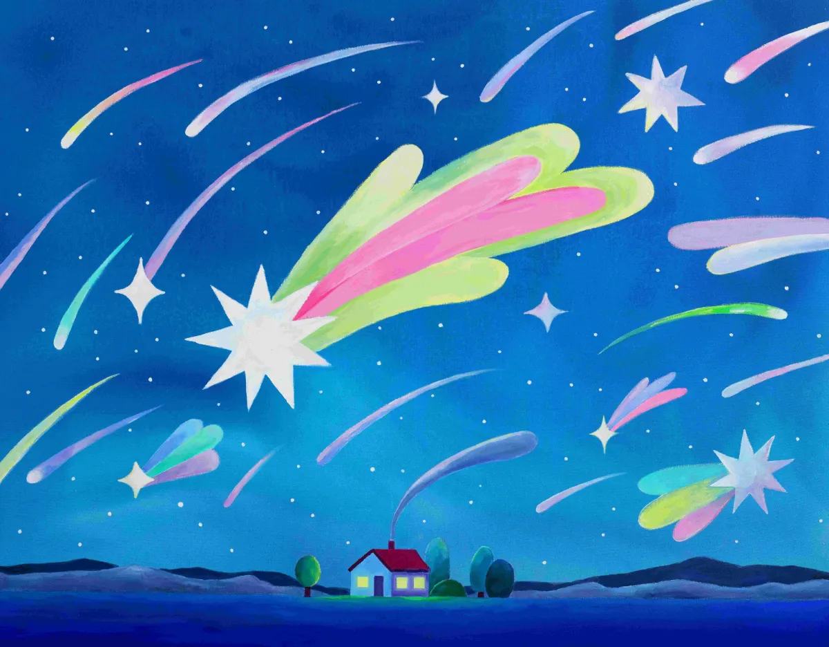 展覧会では、Sha’an d’Anthesが新たに手掛けた鮮やかで夢のような作品が多く展示されます。特に注目すべきは、「Meteor Shower I」や「Your Reflection is a Friend」といった名作で、いずれも視覚的なハーモニーと心温まるメッセージを持っています。各作品は、日常から心を解放し、心の奥深くに触れるものとなるでしょう。