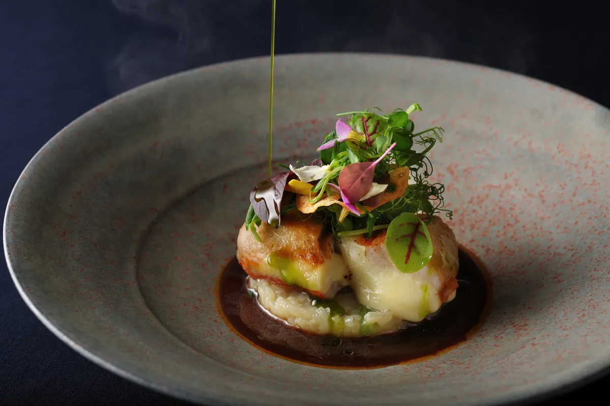 リゾットと魚料理が融合した贅沢な一皿です。スカルモッツァアフカミータという燻製チーズを白身魚で包んで焼き上げ、地元で作られた「アグリガーデン米」を使用したリゾットと共に楽しむことができます。このリゾットは、蕪やその葉と一緒にいただき、様々な風味を引き立てます。また、特製のテガマッチョスープが魚の旨みを引き立て、最後にかけるミントオイルが爽やかさを演出します。