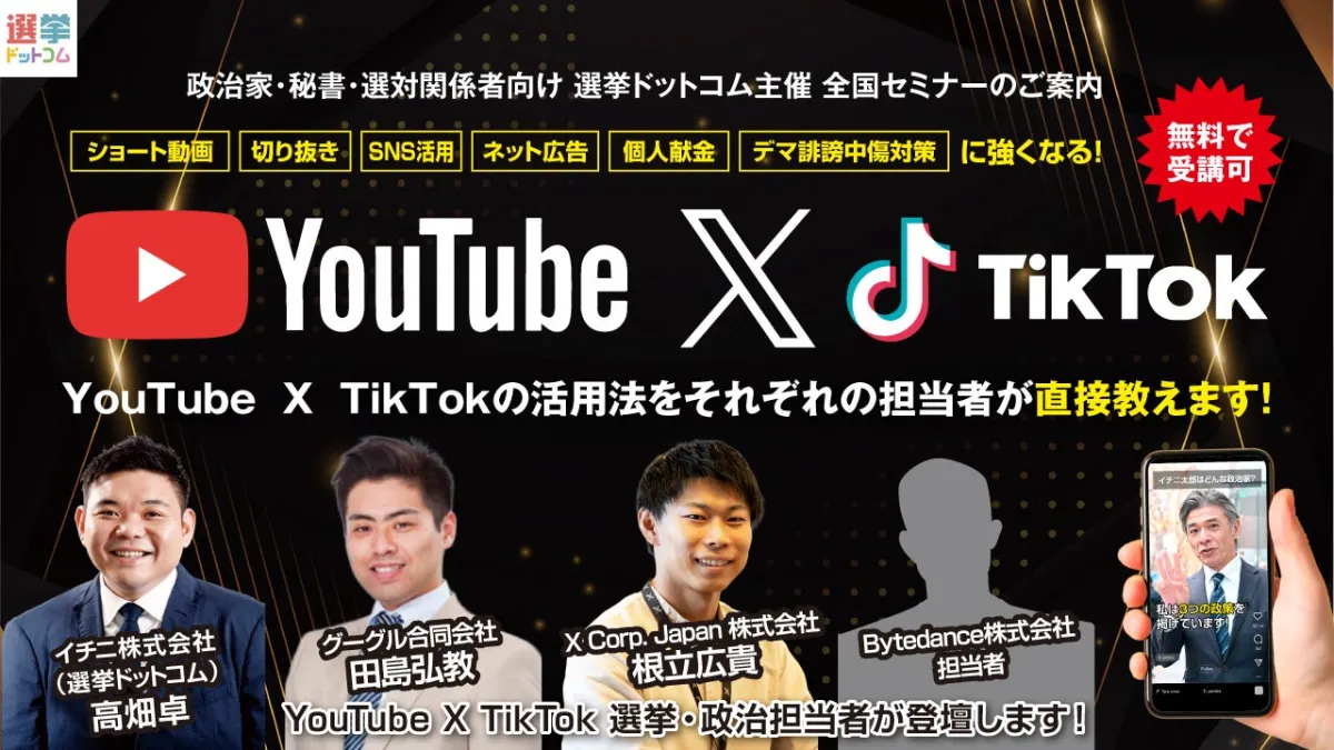 セミナーでは、X(旧Twitter)、YouTube、TikTokの専門家が登壇し、各プラットフォームでの効果的な活用方法を直接指導します。特に、2026年の選挙に向けたSNS対策や投稿戦略が重要視される中、切り抜きや拡散されやすい投稿のテクニック、ショート動画やネット広告の具体的な成功事例をシェアします。