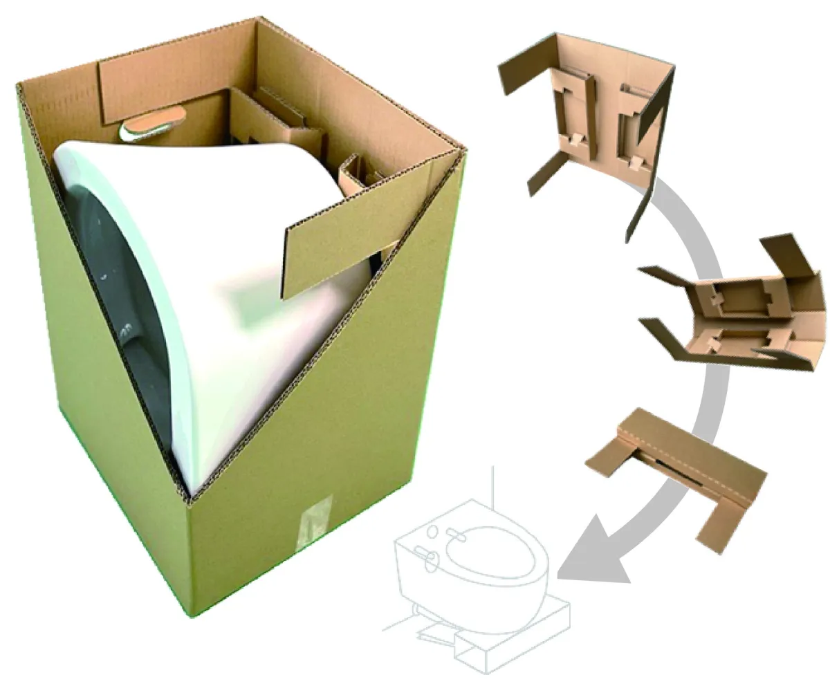素材の集約に成功したこの梱包箱は、6点の内材を1つにまとめる設計とし、流通の効率化を図っています。また、従来の梱包方法に比べて資源の無駄を削減することも可能にしています。