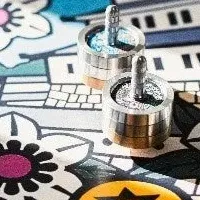 - - perhonen puzzle:幾何学模様の中に蝶がデザインされ、硬質な線とカラフルな表現が特徴。