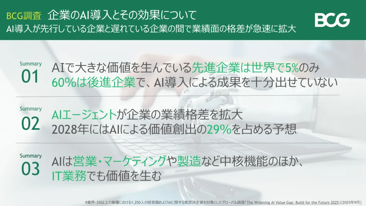 経営コンサルティングファームのボストン コンサルティング グループ(BCG)が発表したレポート「The Widening AI Value Gap: Build for the Future 2025」によれば、企業間でのAI導入とその効果の差がますます明確になっています。