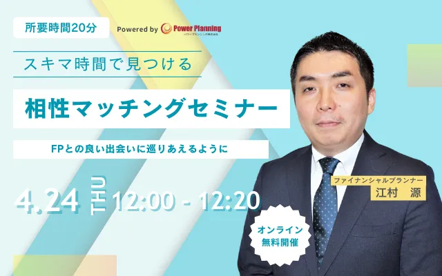 2024年4月24日(木)12時より、無料マネーセミナー提供サービス「アットセミナー」が、スキマ時間に自分にぴったりのファイナンシャルプランナー(FP)を見つけられるオンラインセミナー「相性マッチングセミナー」を開催します。今回は、講師に江村源FPを迎え、より多くの方が理想のFPと出会う手助けをすることを目的としています。