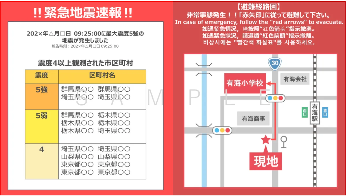 利用者にとって、震災時に避難経路を明確に示す情報を instantly ではなく、事前に準備された情報として提供することは重要です。特に外国人観光客や子どもたちにとっては、迅速な情報伝達が生死を分ける可能性もあります。