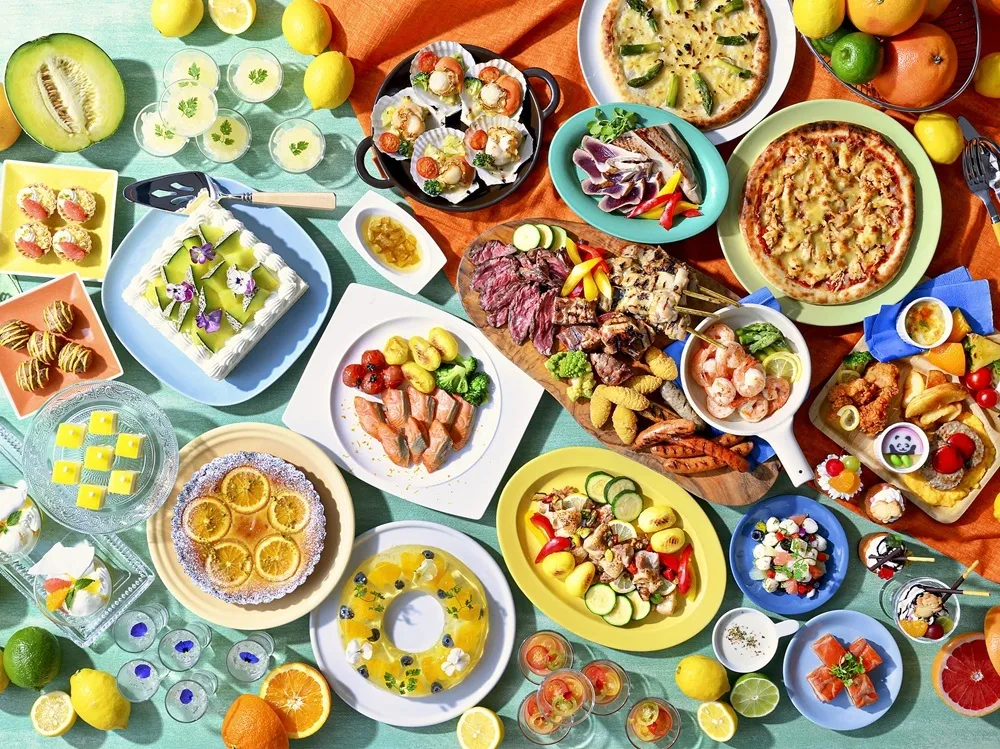 『Early Summer Festa』では、約60種類の多様な料理が用意されており、初夏の季節感を反映した軽やかで爽やかな味わいが特徴です。食事の始まりを飾る冷菜には、「グレープフルーツと貝のセビーチェ セルフィーユの香り」や、そして「冷製トマトムース」、「サーモンマリネと大根のミルフィーユ」が並び、軽い味わいで食欲をそそります。主菜としては、レモンとハーブの香り漂う「チキンのロースト レモンとエストラゴンの白ワインソース」や、エルダーフラワーの華やかさとオレンジの甘みが調和した「サーモングリル エルダーフラワーとバレンシアオレンジのソース」をお楽しみいただけます。